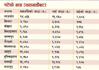 सोमबार निगमले हवाई इन्धनको मूल्य देशभर १ सय ६४ बनाएको छ । सोहीकारण काठमाडौंबाट सुगम (ट्रंक) रुटको हवाई भाडा घटेको छ भने पोखरा र नेपालगन्जबाट दुर्गम रुटका लागि हुने हवाई भाडा बढेको छ । ‘सरकारको पछिल्लो निर्णयले दुर्गमका जनता थप मारमा पर्नेछन्,’ यति एयरलाइन्सका प्रवक्ता भीम राईले भने, ‘सुगम क्षेत्रका यात्रुलाई फाइदा पुगेको खबर आजको नयाँपत्रिका दैनिकले छापेको छ।