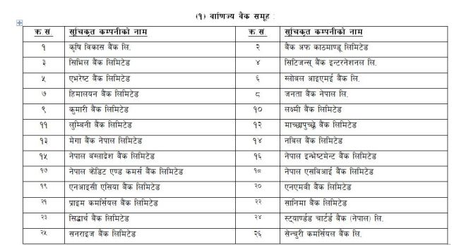 नेप्सेका अनुसार वाणिज्य बैंक समूहबाट २६, विकास बैंक समूहबाट ५६, जलविद्युत समूहबाट तीन, वित्त समूहबाट २५, बीमा समूहबाट १७ उत्पादनबाट एक तथा अन्य समूहबाट एक गरी एकसय ३० कम्पनी क वर्गमा परेका हुन् ।