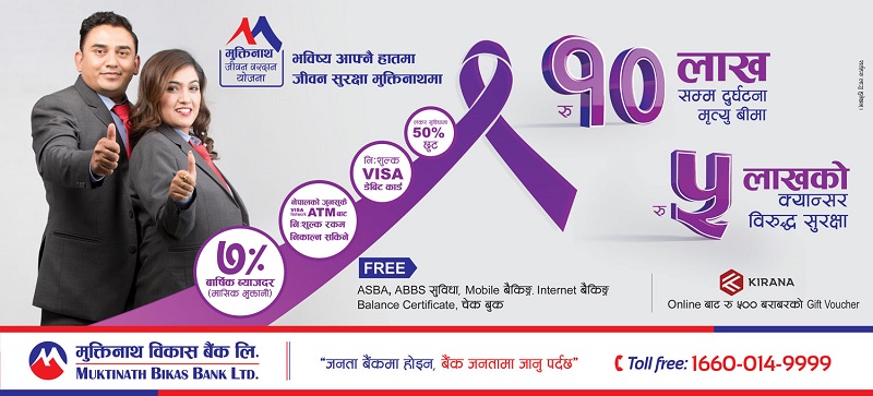 काठमाडौं । मुक्तिनाथ विकास बैंकले मिति ‘मुक्तिनाथ जीवन बरदान योजना’ अन्तर्गत तीन नयाँ बचत खाताहरु सार्वजनिक गरेको छ । बैंकले आजैबाट संचालनमा आउने गरी मुक्तिनाथ जीवन बरदान, मुक्तिनाथ जीवन वरदान प्लस र मुक्तिनाथ जीवन वरदान प्रिमियम खाताहरु सार्वजनिक गरेको हो ।