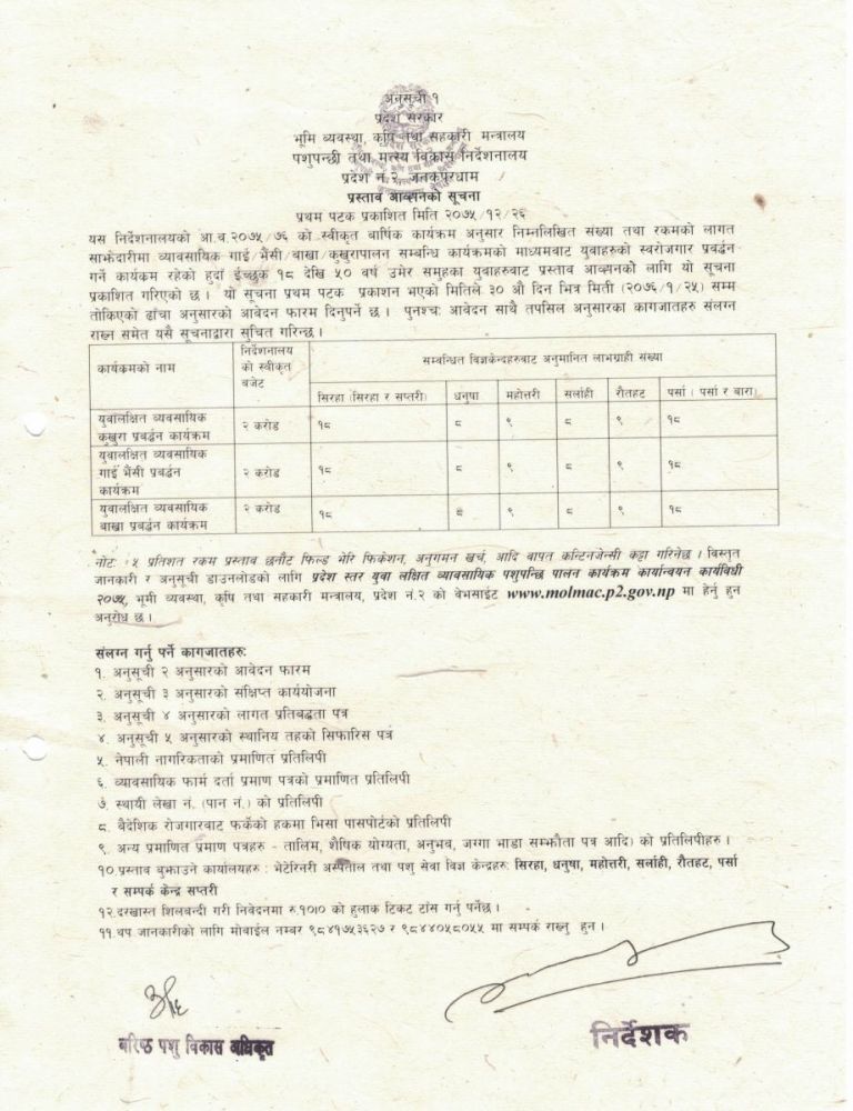 भूमि व्यवस्था, कृषि तथा सहकारी मन्त्रालय, पशुपन्छी तथा मत्स्य विकास निर्देशनालय, जनकपुरधामको आर्थिक वर्ष २०७५/०७६ को स्वीकृत वार्षिक कार्यक्रम अनुसार साझेदारीमा व्यावसायिक गाई/भैँसी/बाख्रा/कुखुरापालनमा अनुदान दिने भएको छ। उक्त निर्देशनालयबाट इच्छुक युवाहरूलाई समयमा नै निवेदन बुझाइ अनुदान लिनका लागि अनुरोध गर्दै सूचना प्रकाशित गरिएको छ।