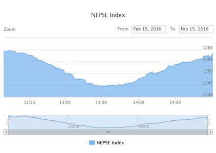 काठमाडौं । सोमबार नेप्से परिसूचक १ दशमलव १२ अंकले घटेर १ हजार २ सय ५८ दशमलव २३ अंकमा कारोबार बन्द भएको छ । खुलेपछि लगातार घटेर १२ सय ४४ बिन्दुसम्म पुगेपनि कारोबार दोश्रो भागमा केहि सम्हालिएको थियो ।