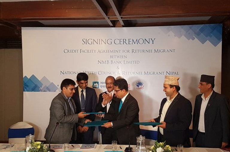 वैदेशिक रोजगारी फर्किएका व्यक्तिलाई नेपालको मौलिक पहिचान, कृषि, पर्यटन, वन, जडिबुटी, खनिज तथा जलस्रोत र विज्ञान तथा प्रविधि क्षेत्रमा काम गर्ने गरी सहुलियतपूर्ण कर्जा दिन र युवा उद्यमशिलता प्रवद्र्धन गर्न बैंकले ऋण दिने सम्बन्धी सम्झौतामा एनएमबी बैँकका प्रमुख कार्यकारी अधिकृत सुनिल केसी, परिषद्का कार्यकारी उपाध्यक्ष माधव ढुङ्गेल र रिटर्नी माईग्रेन्ट नेपालका अध्यक्ष उत्तम अधिकारीले सम्झौता पत्रमा हस्ताक्षर गरे ।