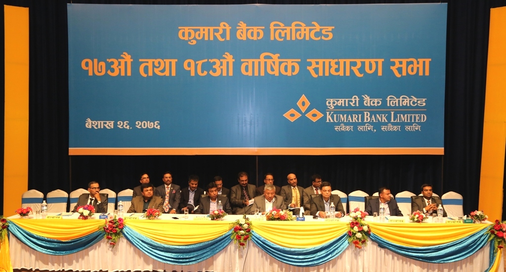काठमाडाै । कुमारी बैंक लिमिटेडको १७ औं तथा १८ औं वार्षिक साधारण सभा बैंकका अध्यक्ष सन्तोष कुमार लामाको अध्यक्षतामा नेपाल प्रज्ञा प्रतिष्ठान, कमलादीमा सम्पन्न भएको छ । उक्त साधारण सभाले लेखापरीक्षकको प्रतिवेदन सहितको आ.व. २०७३÷०७४ र आ.व २०७४÷०७५ को आर्थिक विवरण, वासलात, नाफा नोक्सान हिसाब र सोही अवधिको नगद प्रवाह विवरण, नाफा नोक्सान बाँडफाँट हिसाब, पूँजीमा भएको परिवर्तन लगायत वार्षिक प्रतिवेदन माथि छलफल गरी पारित गरेको छ ।