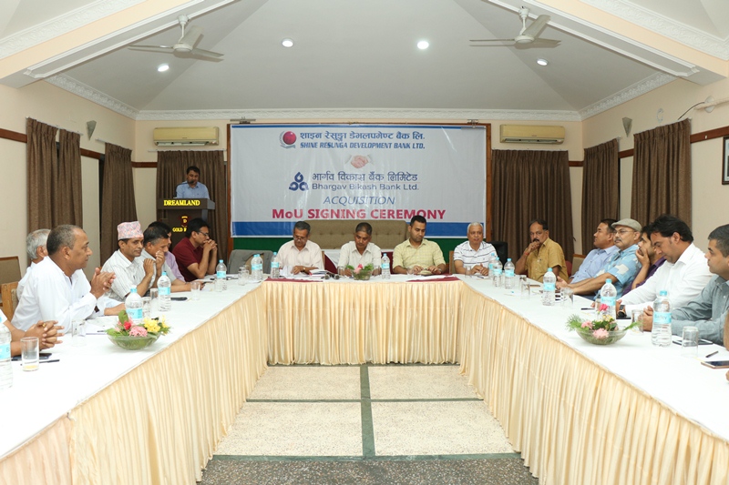 काठमाडाै । शाइन रेसुंगा डेभलपमेण्ट बैंकले भार्गव विकास बैंकलाई एक्वायर गर्ने भएको छ । दुई बैंकबीच प्राप्ति (एक्विजिशन) सम्बन्धी प्रारम्भिक सहमति पत्रमा हस्ताक्षर भएको छ । सहमती पत्रमा शाइन रेसुङ्गा डेभलपमेण्ट बैंक लिमिटेडको तर्फवाट सञ्चालक समितीका अध्यक्ष राजेन्द्र प्रसाद श्रेष्ठ र भार्गव विकास बैंक लिमिटेडका तर्फवाट सञ्चालक समितीका अध्यक्ष डम्बर बहादुर थापाले हस्ताक्षर गरेका छन् ।