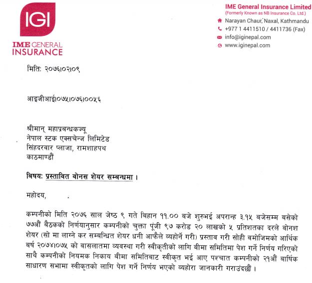 आइएमई जनरल इन्सुरेन्सले ५ प्रतिशत बोनस सेयर दिने