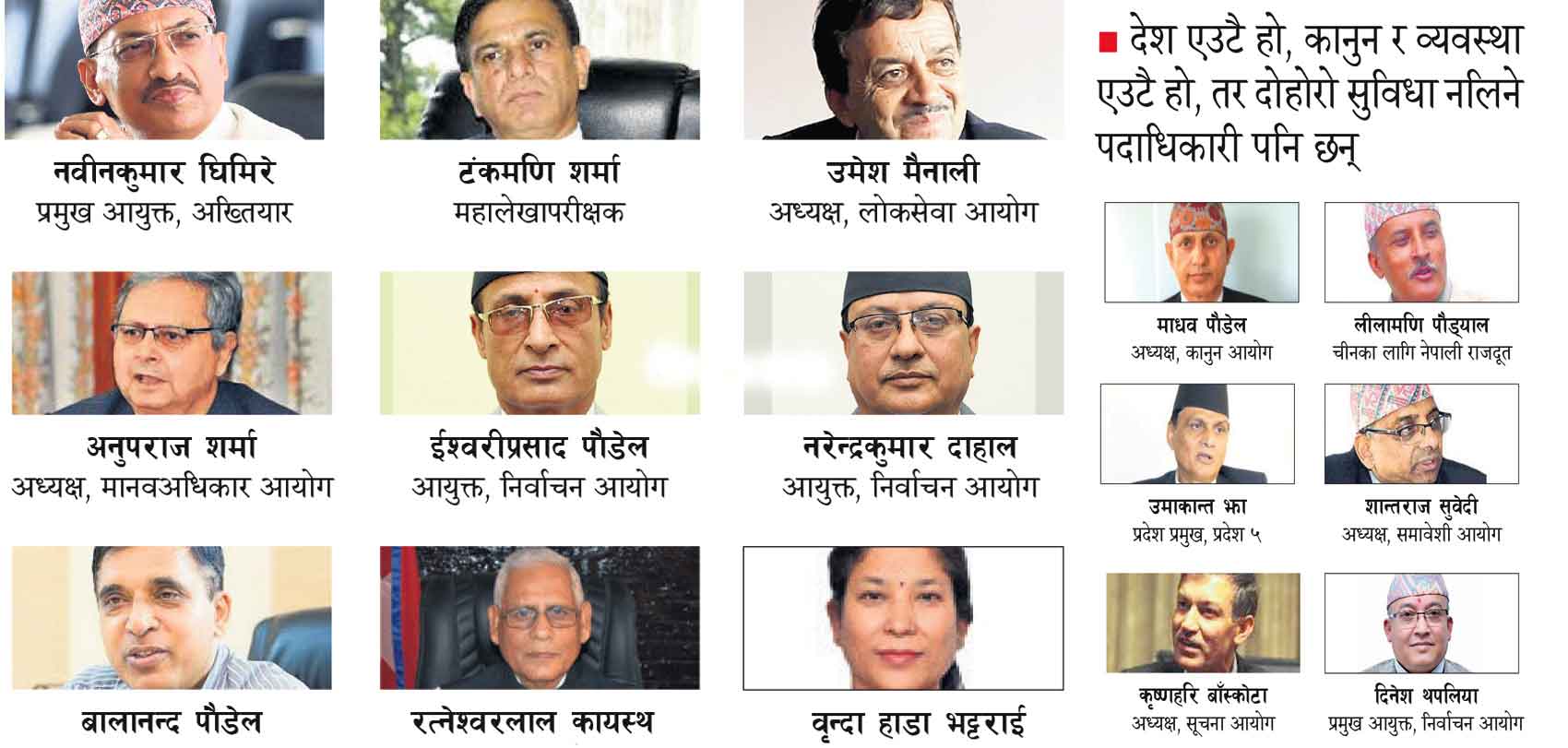 काठमाडाै । स्वच्छ छवि र उच्च नैतिकता भएका व्यक्तिहरू नै संवैधानिक निकायको पदाधिकारी बन्ने अपेक्षा संविधानले गरेको छ । त्यही संविधानअन्तर्गत नियुक्त भएका पदाधिकारीहरूले तलब र पेन्सनमा दोहोरो सुविधा लिइरहेका छन् । नयाँ पत्रिका दैनिकले समाचार छापेकाे छ ।