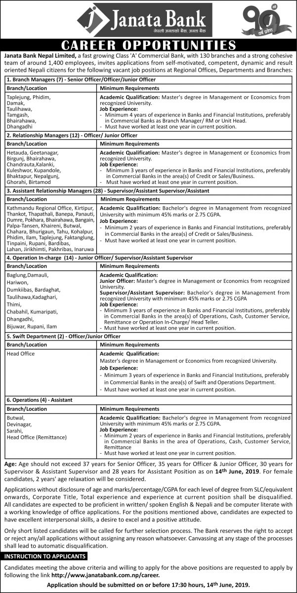 काठमाडाै । जनता बैंकले माग्यो ६७ जना कर्मचारीबैंकले विभिन्न पदका लागि ६७ जना कर्मचारी माग गरेको हो ।