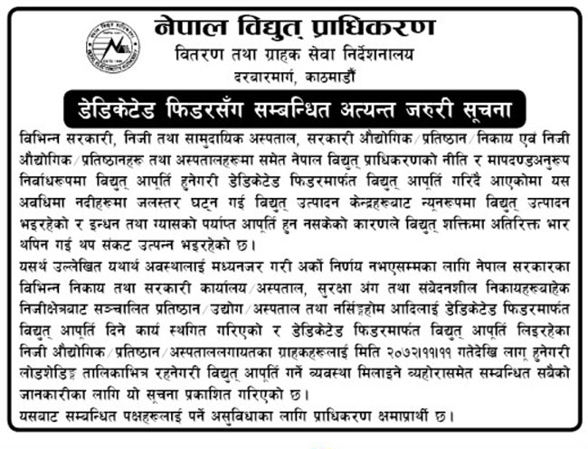 निजी अस्पताल, नर्सिङ होम र औद्योगिक तथा ब्यापारिक प्रतिष्ठान लगायतमा लोडसेडिङ नहुने गरी दिइएको डेडिकेटेड फिडरको सुविधा काट्न लागिएको हो ।
