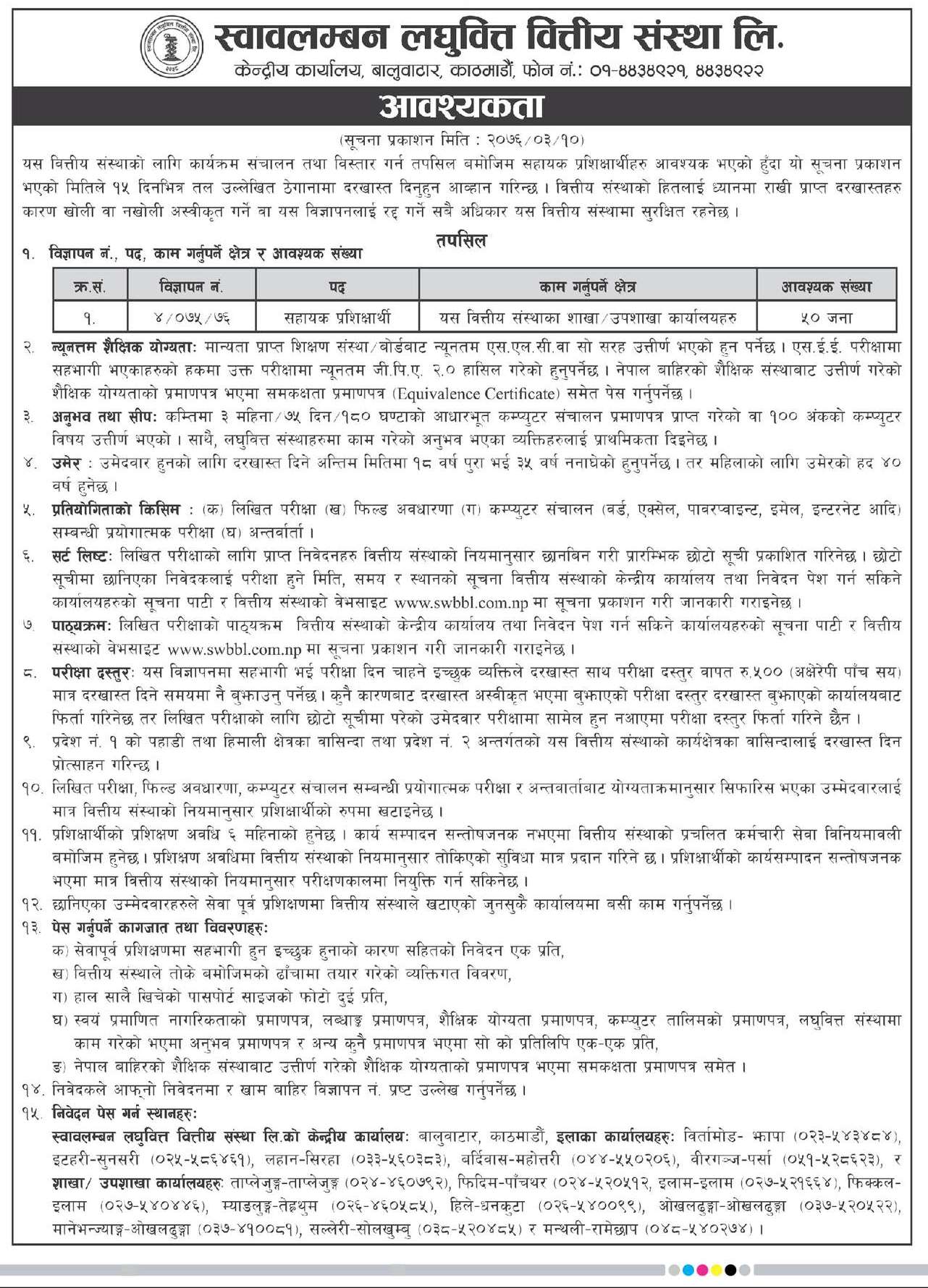 स्वावलम्वन लघुवित्तमा जागिर खुल्यो