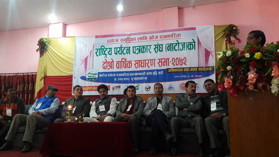 काठमाडौं । राष्ट्रिय पर्यटन पत्रकार संघ (नाटोज)को दोस्रो साधारण सभाले पुन शिव अधिकारीको अध्यक्षतामा १९ सदस्यीय नयाँ कार्यसमिति चयन गरेको छ । अहिले भरखरै कमलादीस्थित सि डब्लु पाटीहलमा सम्पन्न संस्थाको दोस्रो वार्षिक साधारण सभाले सर्वसम्मत रुपमा नयाँ कार्यसमिति चयन गरेको हो । अधिकारी गन्तव्य नेपाल साप्ताहिकका प्रधान सम्पादक हुनुहुन्छ ।