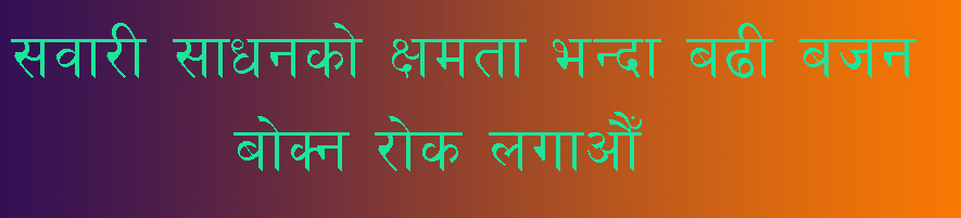 ९) सडक बिभागको मापदण्ड तथा सवारी साधनको क्षमता भन्दा बढी बजन बोक्न रोक लगाऔँ । हामी सबैले टाफिक नियमको पालना गरो र गर्न लगाउँ दुर्घटनाबाट बचौँ र बचाऔँ ।