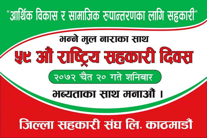 काठमाडौ । आर्थिक विकास र सामाजिक रुपान्तरणका लागि सहकारी भन्ने मूल नारासका साथ देशभर ५९ औं राष्ट्रिय सहकारी दिवस मनाउन शुरु गरिएको छ ।