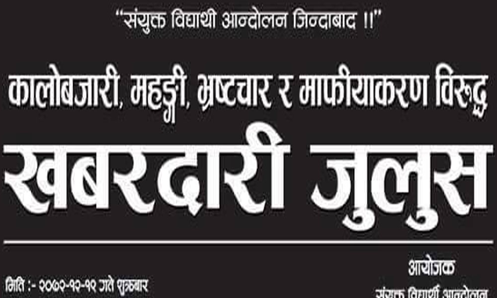 काठमाडैा । देशमा बढ्दै गएको कालोबजारी, महँगी र भ्रष्टाचार विरुद्ध संयुक्त विद्यार्थी आन्दोलनले संघर्षका कार्यक्रमहरु सार्वजनिक गरेको छ ।