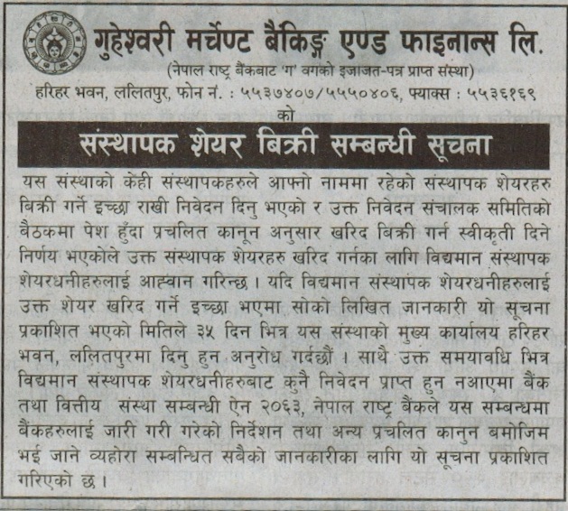 काठमाडौं । गुहेश्वरी मर्चेण्ट बैङ्किङ्ग एण्ड फाइनान्स लिमिटेडको केही संस्थापक शेयरधनीहरुले आफ्नो नाम रहेको संस्थापक शेयर बिक्री गर्ने भएका छन् । इच्छुक संस्थापक शेयरधनीहरुले सूचना प्रकाशित भएको मितिले ३५ दिन भित्र निवेदन दिन सक्नेछन् ।