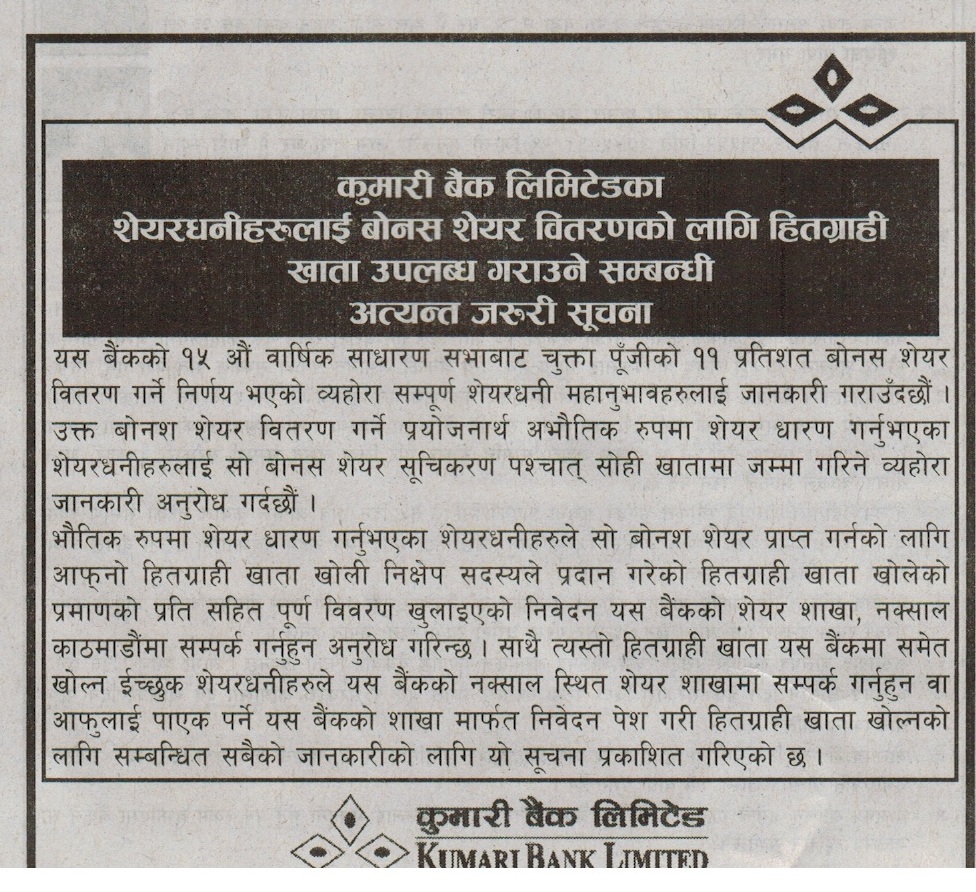 काठमाडौं । कुमारी बैङ्क लिमिटेडले बार्षिक साधारण सभाबाट पारीत भएको ११ प्रतिशत बोनस शेयर वितरण गर्ने भएको छ । बैङ्कले बोनस शेयर हितग्राही खातमा नै जम्मा गर्ने भएकोले शेयरधनीहरुलाई हितग्राही खाता (डिम्याट एकाउण्ट) खोेल्न अनुरोध गरेको छ ।
