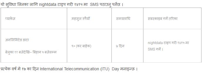 यो सुविधा लिनका लागि nightdata टाइप गरी १४१५ मा म्यासेज पठाउनुपर्नेछ । टेलिकमकी प्रवक्ता प्रतिभा वैद्यका अनुसार प्रत्येक वर्षको मे १७ का दिन इन्टरनेशनल टेलिकम्युनिकेसन डे मनाइन्छ ।