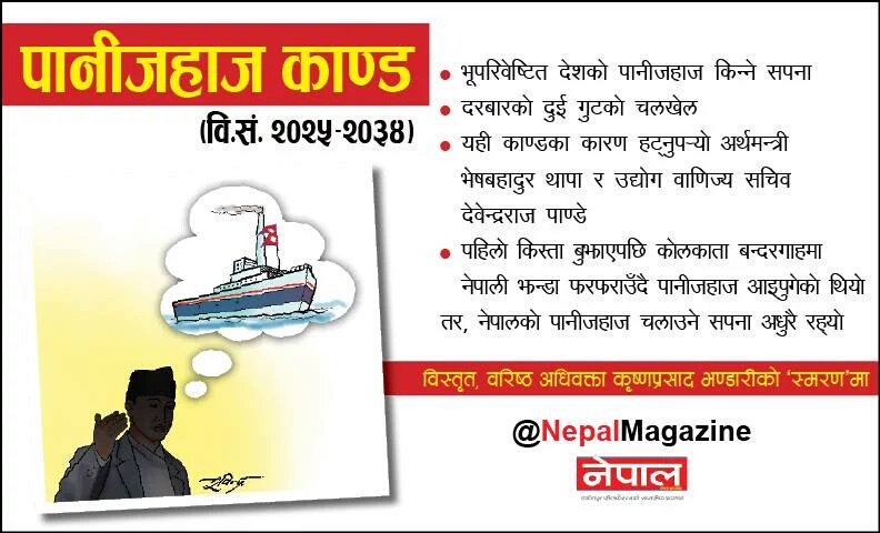 ०३४ सालमा त्यही काण्ड बल्झियो। नेपालका नाममा पानीजहाज भित्र्याएर व्यापार व्यवसाय बढाउने दरबारिया चाहना फेरि सतहमा आयो। तर, नेपालमा पानीजहाज भित्र्याउनु कुनै पनि दृष्टिकोणले फाइदाजनक नरहेको र यसको उपादेयता पनि नरहेको कुरा गरेकै कारण भेषबहादुर थापा अर्थमन्त्री र देवेन्द्रराज पाण्डे उद्योग वाणिज्यसचिवबाट हटाइए। र, पानीजहाज ल्याउने दोस्रो प्रयास पनि तुहियो।