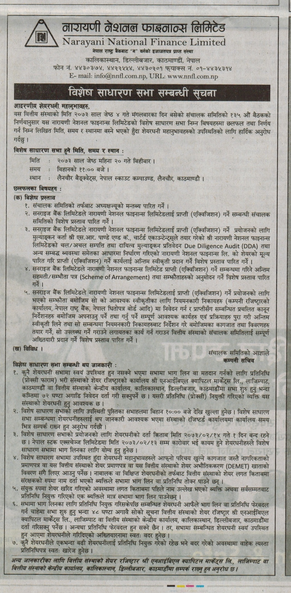 काठमाडौं । नारायणी नेशनल फाइनान्स लिमिटेडको विषेश साधारण सभा जेठ २० गते विशेषा साधरणासभा बोलाएको छ। विशेषासभा लैनचौर बैड्क्वेटसमा आयोजना गरिएको छ। सभामा सनराइज बैङ्क लिमिटेडले नारायणी नेशनल फाइनान्स लिमिटेडलाई प्राप्ती एक्विजेशन गर्ने सम्बन्धी प्रस्ताव प्रस्तुत हुँदैछ। कम्पनीको शेयरधनीको दर्ता पुस्तिका जेठ १४ गते बन्द रहने छ । एक्किजेशनसम्बन्धी सैद्धान्तिक समझदारी सनराइन र नेशनललाइफबीच भइसकेको छ।18 May, 2016 9:38 am