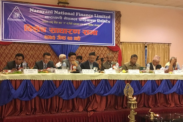 काठमाडाै । नारायणी नेसनल फाइनान्सको बिहीबार सम्पन्न विशेष साधारण सभाले सनराइज बैंकसँग बिलिन हुने (एक्वायर) प्रस्ताव पारित गरेको छ ।नारायणी नेसनललाई प्राप्ति गरेसकेपछि पनि बैंकको नाम सनराइज बैंक नै रहनेछ । सनराइजको एक सय कित्ता बराबर नारायणी नेसनल फाइनान्सको ७७ कित्ता सेयर कायम गरिएको छ ।