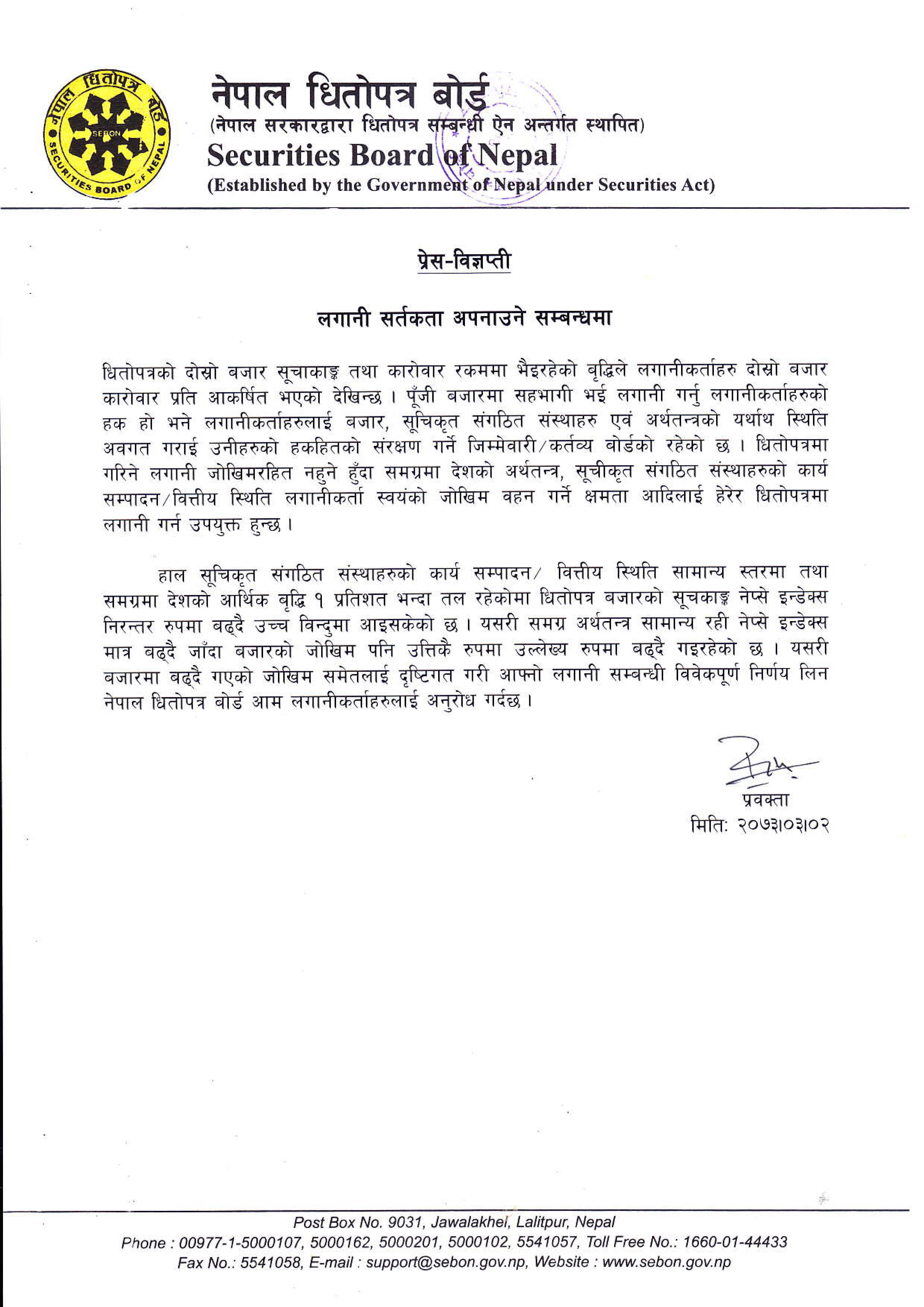काठमाडौं । हाल सुचिकृत संगठित संस्थाहरुको कार्य सम्पादन / वित्तीय स्थिति सामान्य स्तरमा तथा समग्रमा देशको आर्थिक बृद्धि १ प्रतिशत भन्दा तल रहेकोमा धितोपत्र बजारको सूचकाङ्क नेप्से इन्डेक्स निरन्तर रुपमा बढ्दै उच्च विन्दुमा आइसकेको आइरहेको अवस्थामा धितोपत्र बोर्डले लगानीकर्ताहरुलाई सतर्क भएर लगानी गर्न आग्रह गरेको छ ।