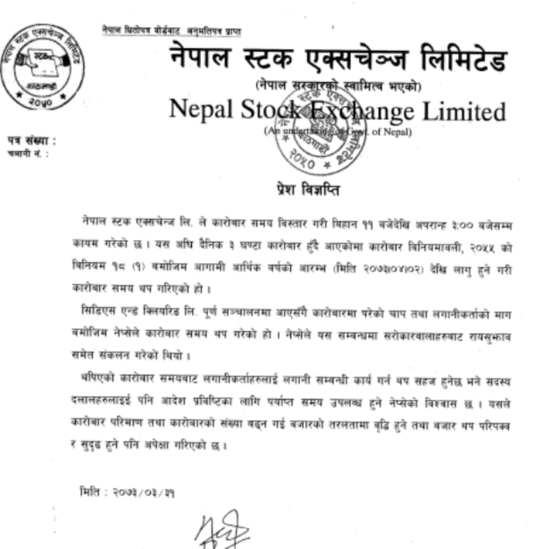 यसअघि सार्वजनिक विदाका दिनहरुमा बाहेक नेप्सेमा आइतबार देखि विहिबार सम्म हप्तामा पाँच दिन दैनिक मध्यान्ह १२ देखि ३ बजेसम्म ३ घण्टा कारोबार हुँदै आएको थियो । अबदेखि नेपाल स्टक एक्सचेञ्ज आइतबार देखि विहान ११ बजे देखि दिउँसो तीन बजेसम्म शेयर कारोबारका लागि खुला हुने नेप्सेले जनाएको छ ।