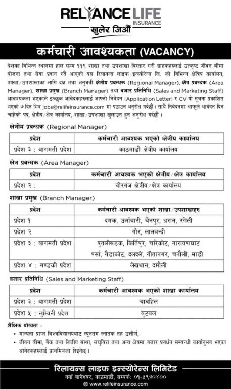 काठमाडौं । रिलायन्स लाइफ इन्स्योरेन्स लिमिटेडले ठुलो संख्यामा कर्मचारीको माग गरेको छ । कम्पनीले आफ्नो विभिन्न कार्यालयको लागि कर्मचारीको आवेदन माग गरेको हो ।