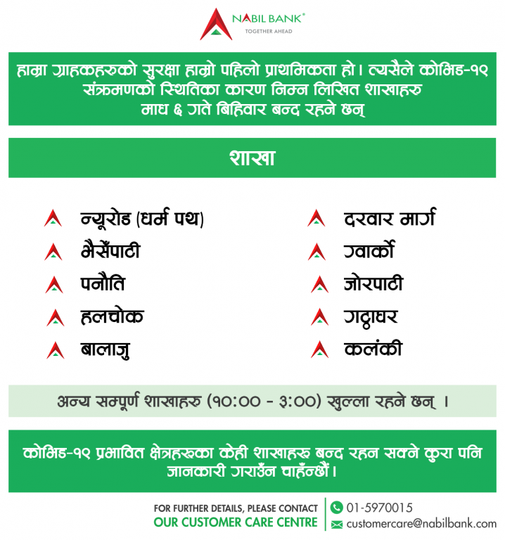 काठमाडाैं । कोभिडको तेस्रो लहरबाट सिर्जना भएको असहज परिस्थितिका कारण एनबिल बैंकले केही शाखा कार्यालय र विस्तारित काउन्टर बन्द गर्ने निर्णय गरेको छ।