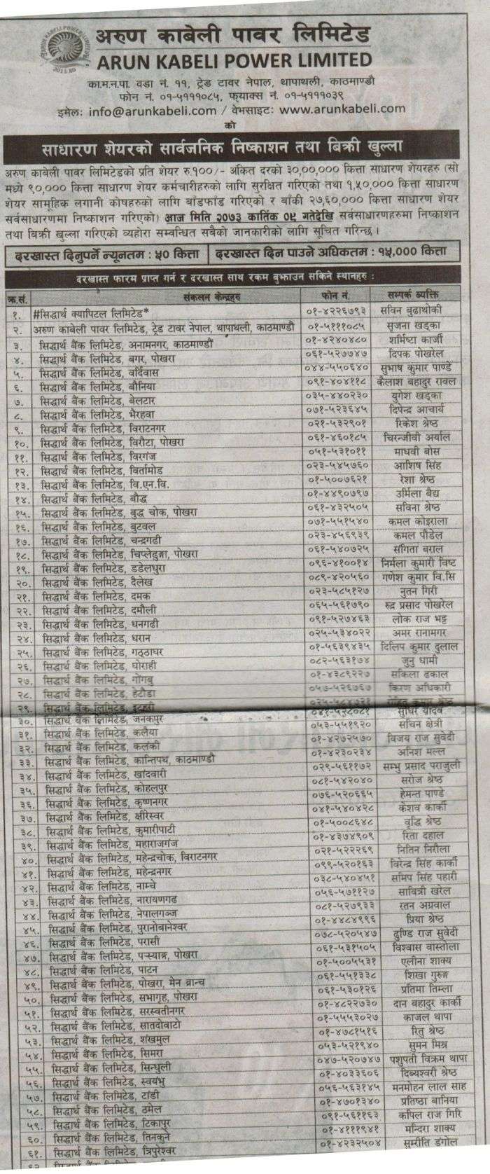 यो सेयरमा न्यूनतम ५० कित्ता र अधिकतम १५ हजार कित्तासम्मका लागि आवेदन दिन पाइनेछ । अरुण काबेलीमा बिक्री प्रबन्धकको काम सिद्धार्थ क्यापिटल लिमिटेडले गर्दैछ ।