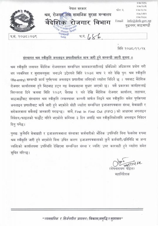 अनलाइन प्रणालीले बैदेशिक रोजगार विभागमा हुने भिडभाड हट्न गई सेवाप्रवाहमा सुधार आएकाले उक्त कार्यलाई निरन्तरता दिदै यो व्यवस्था लागु गरेको जनाएको छ ।
