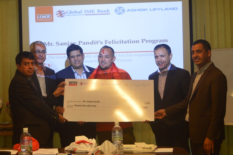 काठमाडौं ५ मंसिर । अफ्रिकाको सर्वोच्च शिखर किलिमञ्जरो र अष्ट्रेलियाको सर्वोच्च शिखर कोजियस उल्टो हिडेर आरोहण गर्ने आरोही संजय पण्डितलार्इ आर्इएमर्इ,ग्लोबल आर्इएमर्इ बैंक र एलटी इन्टरप्रार्इजेजले संयुक्त रुपमा एक लाख रुपैयाँ नगदसहित सम्मान गरेको छ।