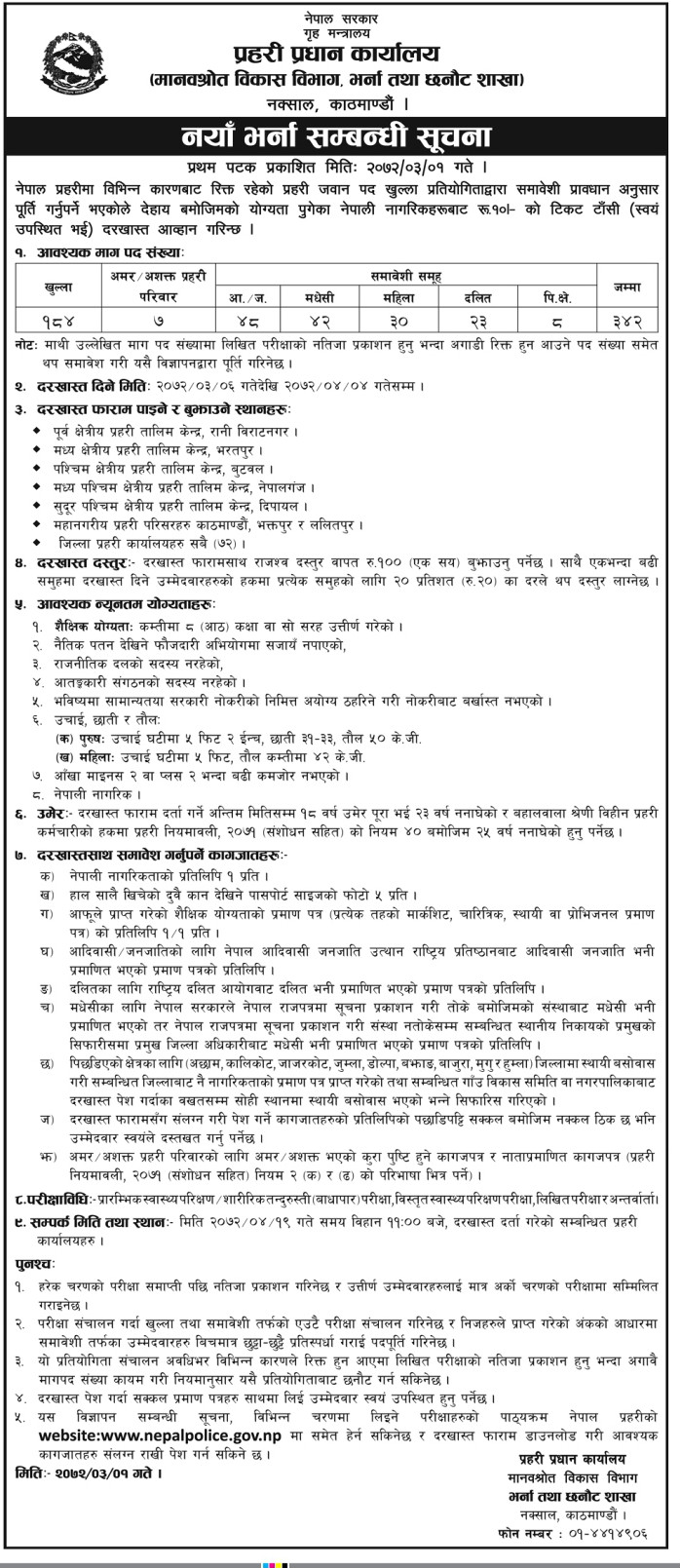काठमाडौं । नेपाल प्रहरीले ३ सय ४३ जनाका लागि आवेदन माग गरेको छ । प्रहरीले रिक्त रहेको प्रहरी जवान पदमा ३ सय ४२ जनाका लागि स्थायी रोजगारी खुलेको हो ।