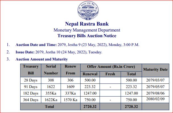 यस बिल आगामी भदौ ७ गते परिपक्व हुनेछ । त्यसैगरी केन्द्रीय बैंकले १८२ दिनको लागि १२ अर्ब ४७ करोडको ट्रेजरी बिल जारी गर्न लागेको हो । यो बिल भने आगामी मंसिर ६ गते परिपक्व हुनेछ । त्यसैगरी १ वर्षको लागि ७ अर्ब ५० करोडको ट्रेजरी बिल जारी हुने भएको छ ।
