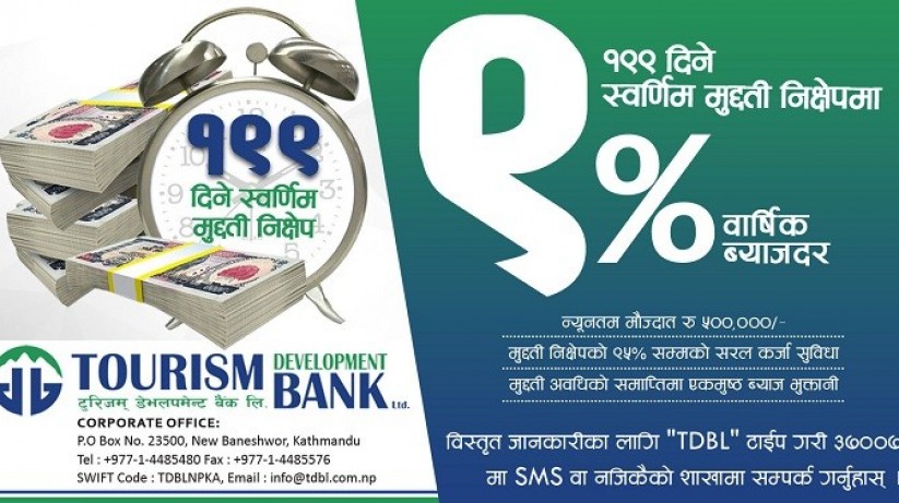 काठमाडौं २१ मंसिर । टुरिजम् डेभलपमेन्ट बैंकले ग्राहकहरुका लागि उच्च प्रतिफल प्रदान गर्ने गरी ”१९९ दिने स्वर्णिम मुद्धती निक्षेप योजना” ल्याएको छ ।