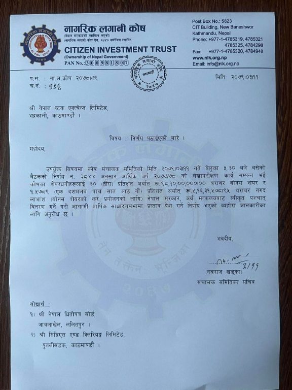 सो लाभांश नेपाल सरकार, अर्थ मन्त्रालयबाट स्वीकृत भई आगामी वार्षिक साधारण सभाले पारित गरेपश्चात सो लाभांश वितरण गरिनेछ।