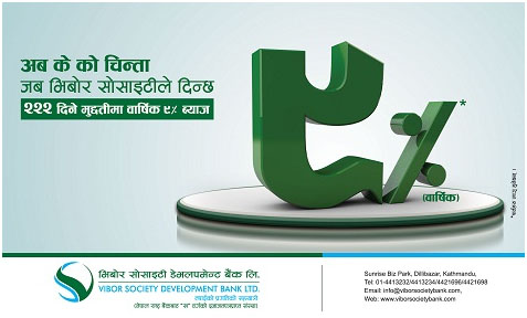 काठमाडौं मंसिर २२ । भिबोर सोसाइटी डेभलपमेन्ट बैंकले २२२ दिने मुद्दतीनिक्षेप योजना ल्याएको छ । यो योजना अन्तर्गत ग्राहकले नौ प्रतिशत (९%) प्र.ब. ब्याजदर प्राप्त गर्न सक्नेछन् ।