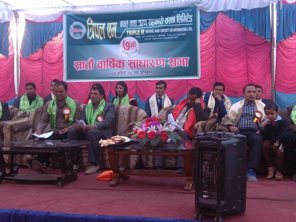 काठमाडौ २५ मसिर । त्रिपल एम बचत तथा ऋण सहकारी संस्थाले सातौ बार्षिक साधारण सभा सम्पन्न गरेको छ । राजधानीमा आयोजित साधारण सभामा जिल्ला सहकारी संघका अध्यक्ष टेक प्रसाद चौलागाईले सबै सहकारी संस्थाहरुले समाजप्रति उत्तारदायी भएर काम गर्न आग्रह गरे ।