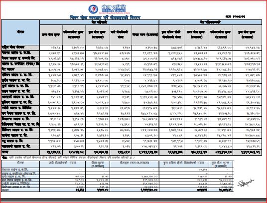 जेठ महिनामा कम्पनीहरूमा ९ लाख २१ हजार ८९४ वटा बीमालेख जारी भएका छन् । चालु आर्थिक बर्षको ११ महिनामा सबैभन्दा बढी नेपाल लाइफ इन्स्योरेन्सले ३० अर्ब ६७ करोड ९० लाख २ हजार रुपैयाँ कुल बीमा शुल्क आर्जन गरेको छ । त्यस्तै दोस्रोमा एलआइसी नेपालले १४ अर्ब ७९ करोड १० लाख रुपैयाँ, तेस्रोमा नेशनल लाइफ इन्स्योरेन्सले १२ अर्ब ७ करोड २७ लाख रुपैयाँ, चौथोमा राष्ट्रिय बीमा संस्थानले ७ अर्ब ४९ करोड ५१ लाख रुपैयाँ, पाँचौमा यूनियन लाइफ इन्स्योरेन्सले ६ अर्ब ९३ करोड ७ लाख रुपैयाँ बीमा शुल्क आर्जन गरेका हुन् ।