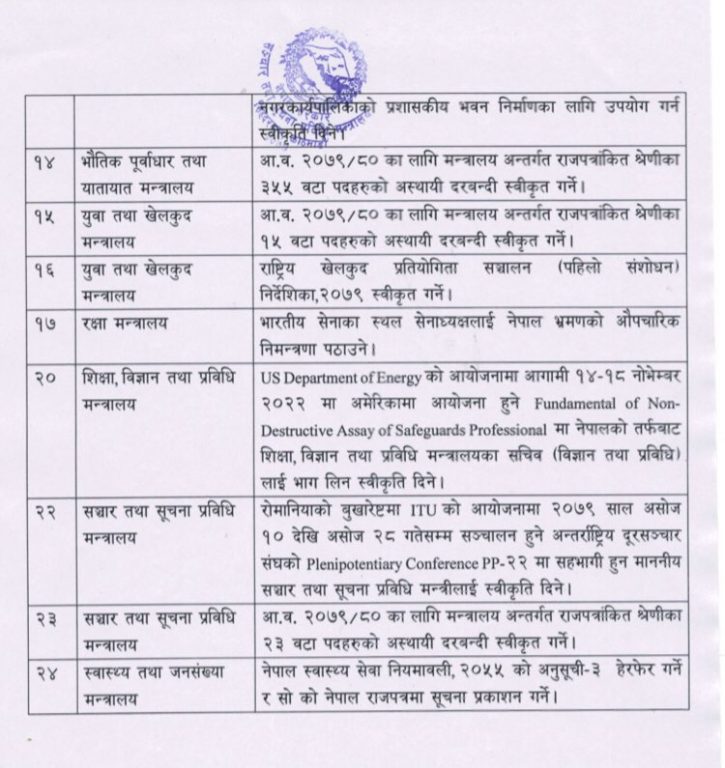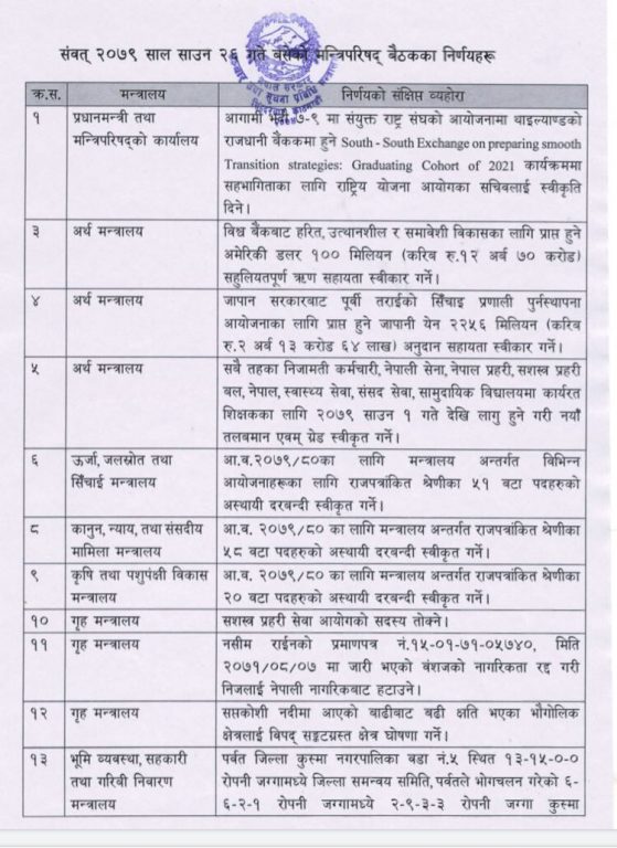 प्रवक्ता कार्कीले सबै तहका निजामती कर्मचारी, नेपाली सेना, नेपाल प्रहरी, सशस्त्र प्रहरी बल, नेपाल स्वास्थ्य सेवा, संसद सेवा, सामुदायिक विद्यालयमा कार्यरत शिक्षकका लागि २०७९ साउन १ गतेदेखि लागू हुने गरी नयाँ तलबमान एवम् ग्रेड स्वीकृत गर्ने निर्णय गरेको जानकारी दिएका हुन् ।