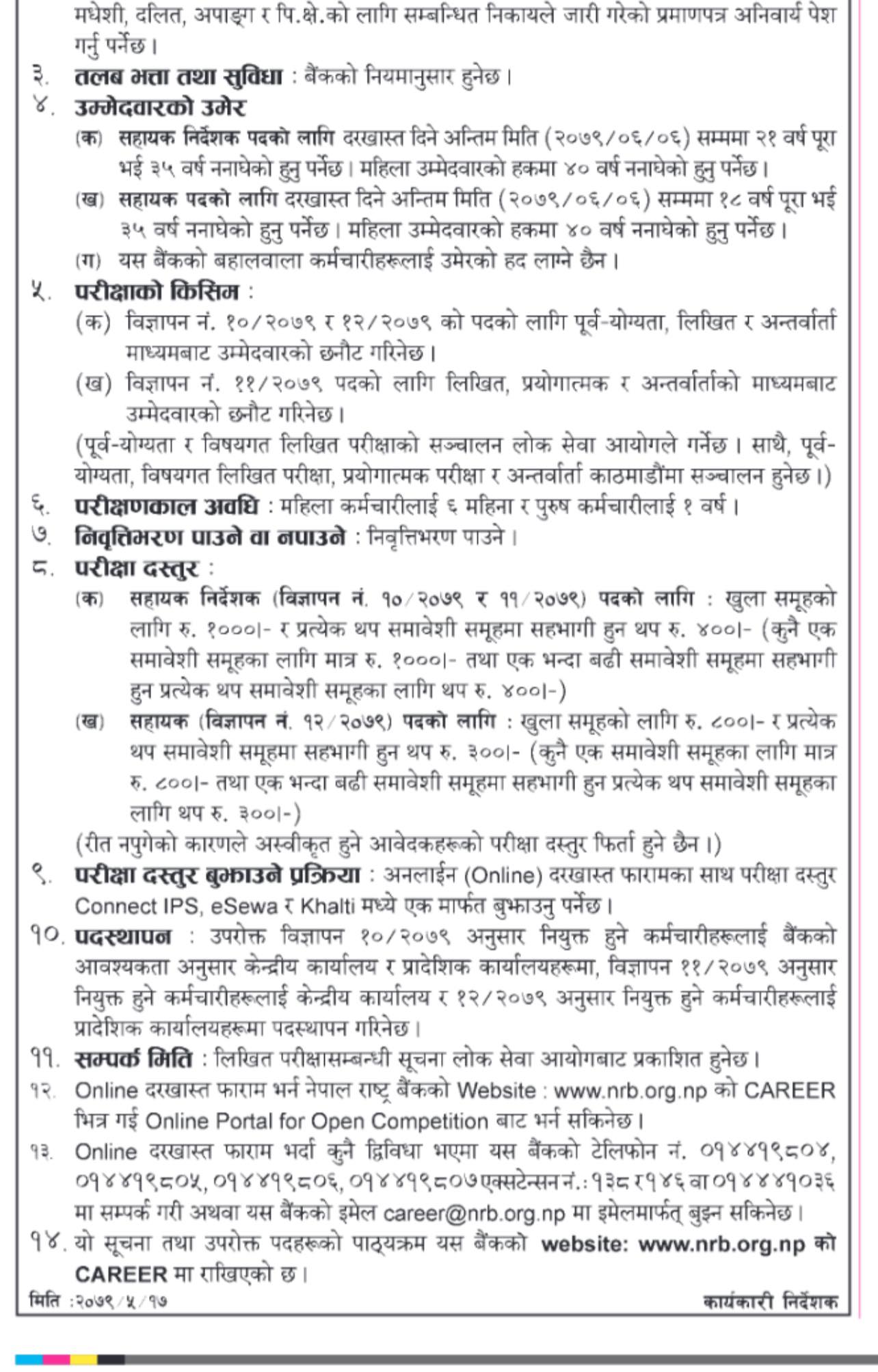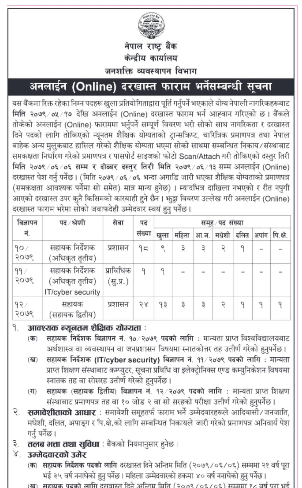 काठमाडाै । नेपाल राष्ट्र बैंकमा रोजगारी खुलेको छ । बैंककाले सहायक निर्देशक (प्रशासन) १८ जना, सहायक निर्देशक (प्राविधिक) १
