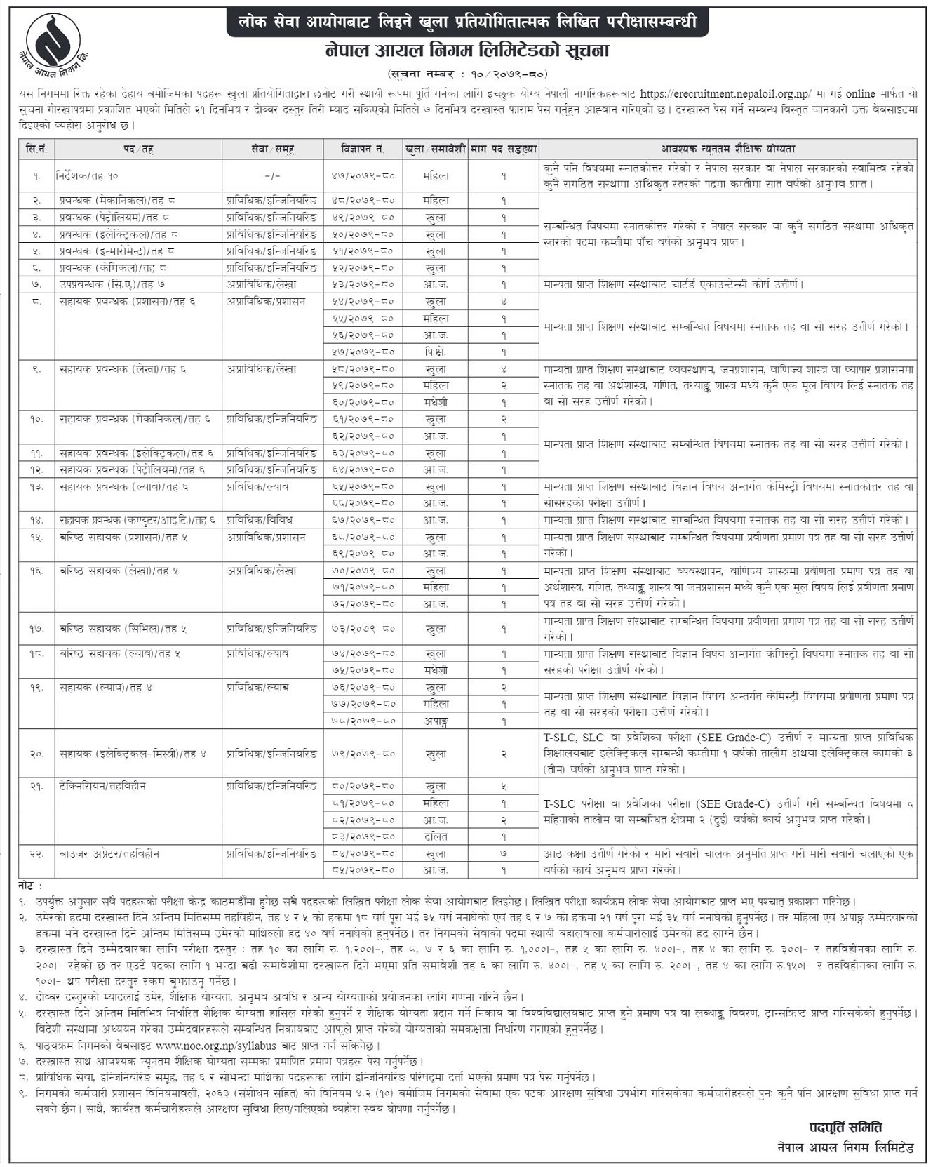 काठमाडौं । नेपाल आयल निगम लिमिटेडले खुला प्रतियोगितात्मकद्धारा जागिर खुलाएको छ । निगमले रिक्त रहेका विभिन्न पदपूर्तिका लागि दरखास्त पेश गर्न आह्वान गरेको हो ।