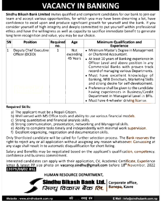 काठमाडौं । सिन्धु विकास बैंक लिमिटेडले कर्मचारीको माग गरेको छ । बैंकले डेपुटी चिफ एक्ज्युकेटिभ अफिसर (डिसिइओ) माग गरेको हो । सो पदका लागि बैंकले व्यवस्थापन संकायअन्तर्गत स्नाकोत्तर तह उर्तिण अर्थात् चार्टर्ड अकाउन्टेन्टमा स्नाकोत्तर गरेको हुनुपर्ने जनाएको छ ।