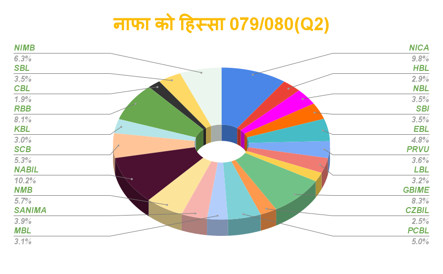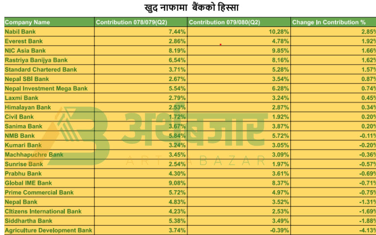 दोस्रो त्रैमाससम्म सबैभन्दा बढी नाफाको हिस्सा परिर्वतन हुनेमा नबिल बैंक रहेको छ । यस बैंकको हिस्सा यस अवधिसम्म आइपुग्दा २.८५ प्रतिशतले बढेर १०.२८ प्रतिशत पुगेको छ । गत बर्षको यही अवधिमा यस्तो हिस्सा ७.४४ प्रतिशत मात्र रहेको थियो । नबिल बैंकले नाफाको हिस्सा परिर्वतनमा मात्र नभएर खुद नाफा कमाउनमा पनि पहिलो स्थान ओगटेको छ ।