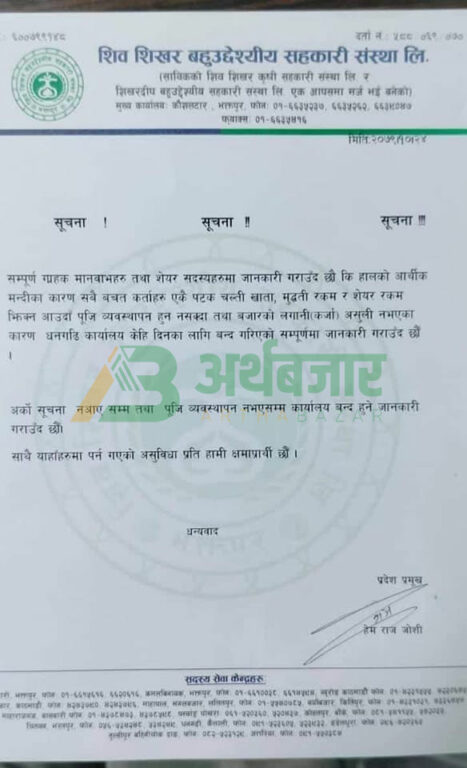 उसले हाल आर्थिक मन्दीका कारण सबै बचत कर्ताको एकै पटक चल्ती खाता मुद्दती रकम र शेयर रकम झिक्न आउदा पूँजी व्यवस्थापन गर्न कठिन भएको र कर्जा अशुलीका लागि समस्या भएको देखाउदै कार्यलय बन्द गरेको हो । उसले अर्को सूचना नआए सम्म र पूजी व्यवस्थापन नभए सम्म कार्यलय बन्द राख्ने जनाएको छ ।