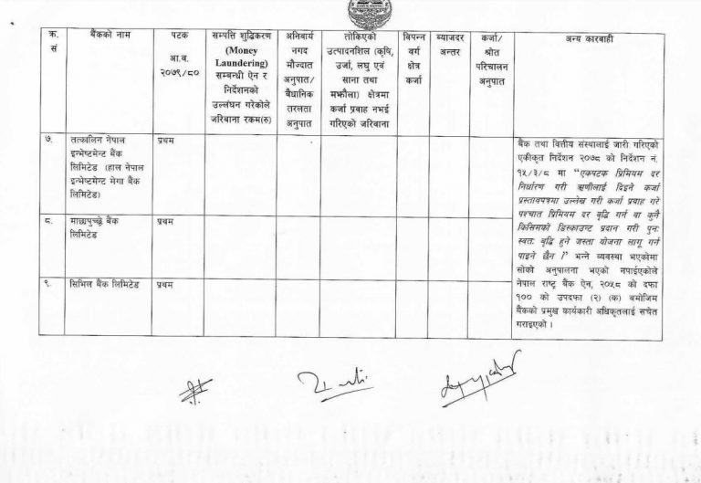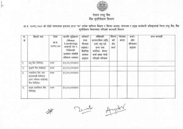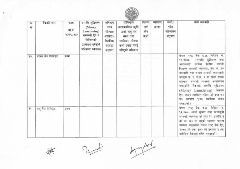 केन्द्रीय बैंकले प्रभु बैंक, कुमारी बैंक, तत्कालिन बैंक अफ काठमान्डू (हाल ग्लोबल आइएमई बैंक) र प्राइम कमर्सियल बैंकलाई ५० लाख रुपैयाँका दरले जरिवाना तिराएको छ । प्रभु बैंकलाई कर्जा सूचना तथा कालो सूची सम्बन्धी व्यवस्था पालना नगरेको भन्दै राष्ट्र बैंकले सचेत पनि गराएको छ ।