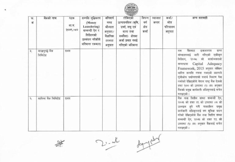 यता, सानिमा बैंकले तत्कालिन प्रमुख कार्यकारी अधिकृतलाई थप सुविधा प्रदान गरेको देखिएपछि राष्ट्र बैंकले सचेत गराएको छ । यस्तै, नबिल बैंकले पनि ‘सम्पति शुद्धिकरण तथा आतंकवादी कार्यमा वित्तीय लगानी निवारण सम्बन्धी व्यवस्था’ मा रहेको ग्राहक पहिचान सम्बन्धी व्यवस्था कार्यान्वयन नगरेको भन्दै राष्ट्र बैंकले सचेत गराएकोे छ ।