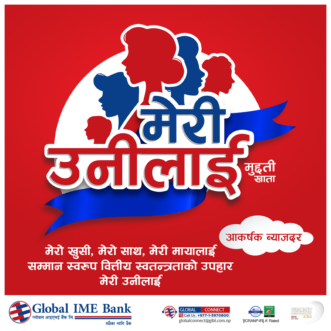 काठमाडौं । ग्लोबल आइएमई बैंकले नयाँ विशेषताका साथ ‘मेरी उनीलाई’ मुद्धती खाता योजना ल्याएको छ । हाल कायम ‘मेरी उनीलाई’ मुद्धती खातालाई परिमार्जन गरी यो योजना संचालनमा ल्याइएको हो ।