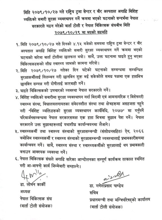 आज विहान ८ बजे देखि प्रधानमन्त्री कार्यालयका सचिव डा गणेश पाण्डे नेतृत्वको सरकारी बार्ता टोली र डा लोचन कार्की नेतृत्वको चिकित्सकहरुको बार्ता टोलीले सिंहदरबारस्थित प्रधानमन्त्री कार्यालयमा बार्ता गरेका थिए ।