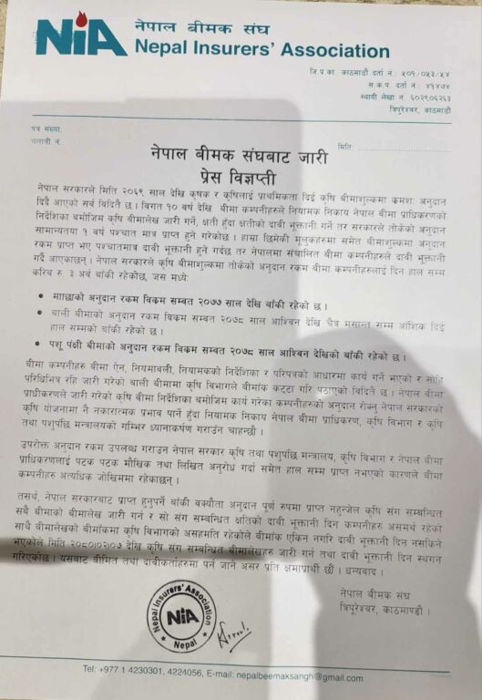 निर्जीवन बीमा कम्पनीहरूकाे संस्था नेपाल बीमक संघले प्रेस विज्ञप्ती जारी गर्दै जेठ ७ गतेदेखि कृषी बीमालेख जारी गर्ने र बीमालेख अन्तर्गतकाे दाबी भुक्तानी दिने कार्य बन्द गरिने जानकारी गराएकाे हाे ।