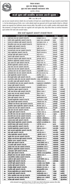 ‘युवा तथा साना व्यवसायी स्वरोजगार कोषसँग थोक कर्जा सम्झौता गरी लिएको ऋण आजको मितिसम्म पनि चुक्ता नभएकोले आजको मितिले ३५ दिन भित्र कोषलाई बुझाउनु पर्ने सावाँ, व्याज र हर्जना सहितको सम्पूर्ण रकम बुझाउनका लागी यो सूचना प्रकाशित गरिएको छ’ कोषले प्रकाशित गरेको सूचनामा भनिएको छ ।
