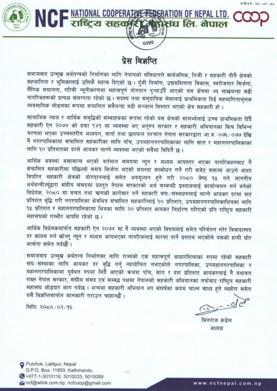 आर्थिक विधेयकमार्फत सहकारी ऐन २०७४ मा नै व्यवस्था भएको विषयलाई समेत परिर्वतन गरेर विवादास्पद दर कायम गर्न खोज्नु न्यून र मध्यम आयभएका नागरिकलाई मारमा पार्ने प्रस्ताव भएकाले यसको हामी घोर भत्र्सना समेत गर्दछौं, विज्ञप्तीमा भनिएको छ ।